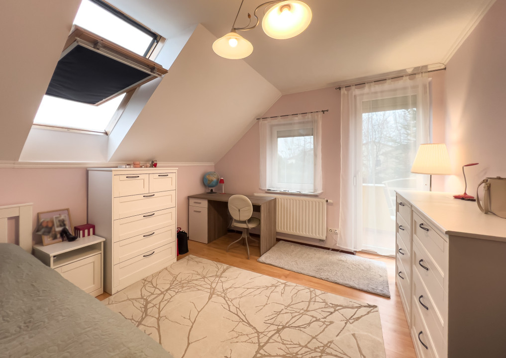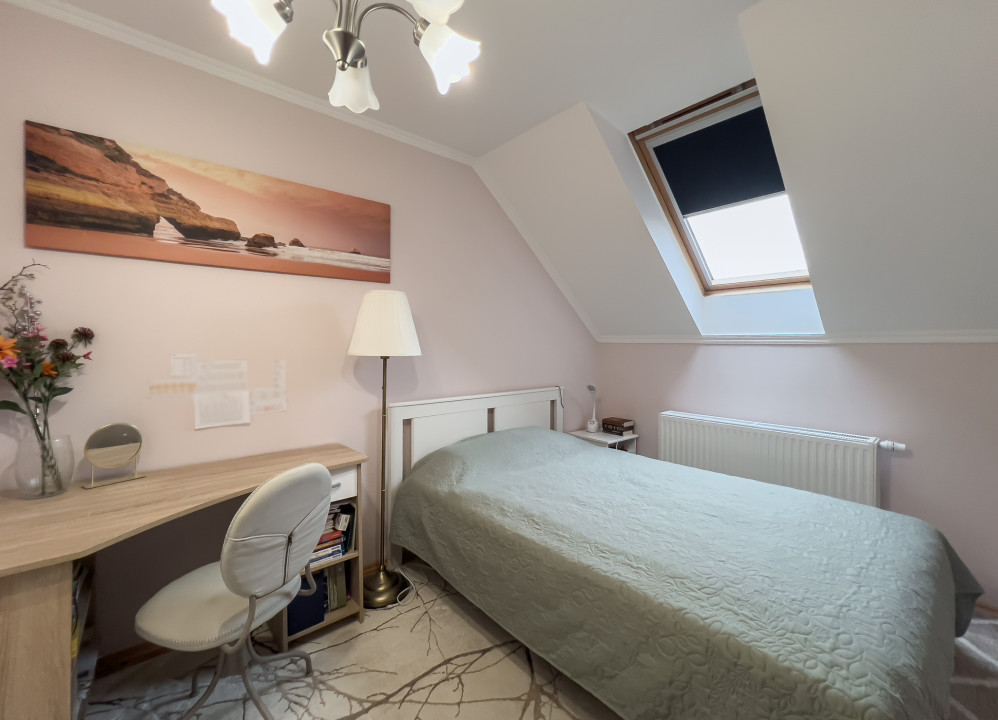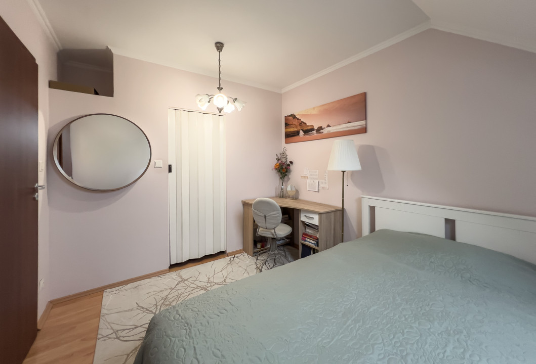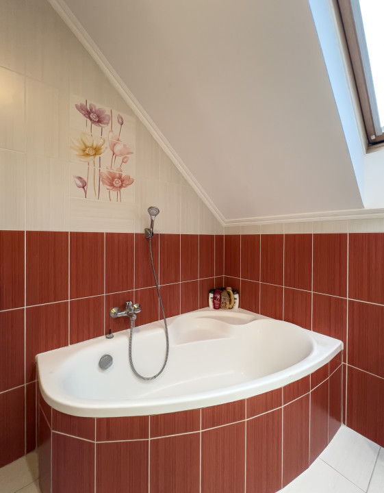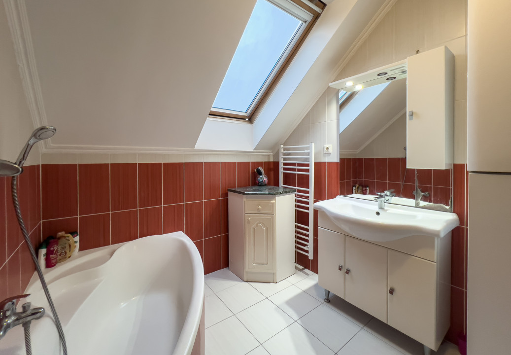 Az emeleti részen 2 db utcafront felé nyíló hálószoba épült, mindkét szobából nyitható 5 nm-es közös erkéllyel. Egy harmadik hálószoba gardróbbal és kádas fürdőszoba is megtalálható még az emeleten .