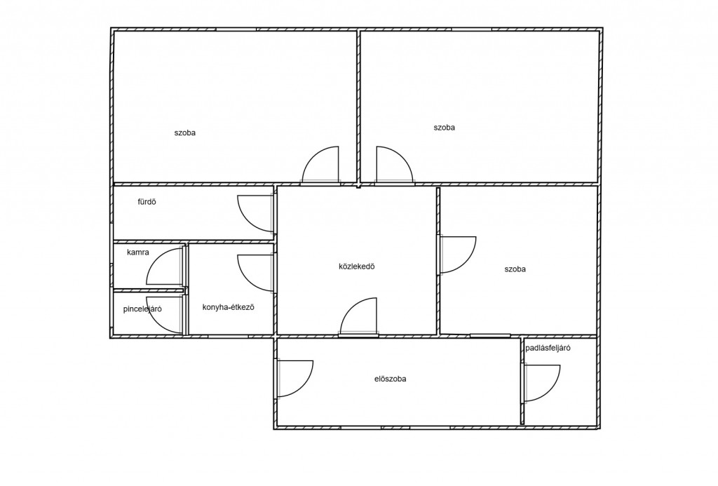Elrendezés: Praktikus és tágas. Az alaprajz szerint a házban 3 külön nyíló, tágas szoba, egy közlekedő (vagy étkező), konyha-étkező, kamra, és egy kádas fürdőszoba egyben a WC-vel található.