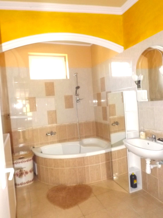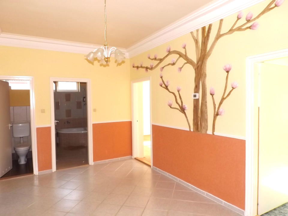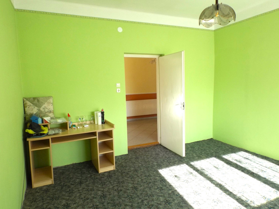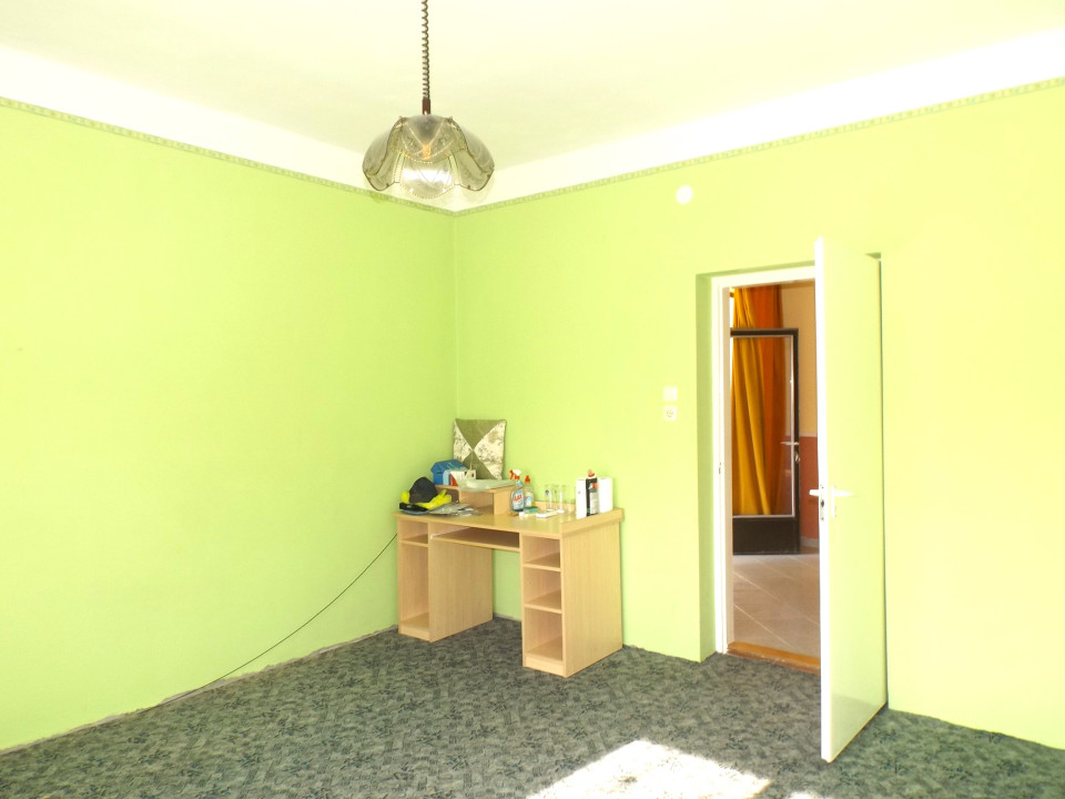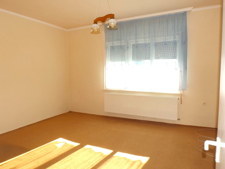 Helyiségei: terasz, előtér, innen nyílik 3 nagy szoba, mely szőnyegpadló burkolattal rendelkeznek. Az előtér végében különálló toalett, mellette zuhanyos és sarokkádas fürdőszoba foglal helyet. Balra a tágas étkező, konyha,(konyhabútor nem található benn) innen kijárat nyílik a kazánházba, ahol a cirkókazán és a vegyes tüzelésű kazán foglal helyet. Udvarban: műhely, fatároló és fedett gépkocsibeálló található. A telek szép, széles, négyzet alakú 1-2 gyümölcsfa és fiatal ültetésű díszbokor takarja.