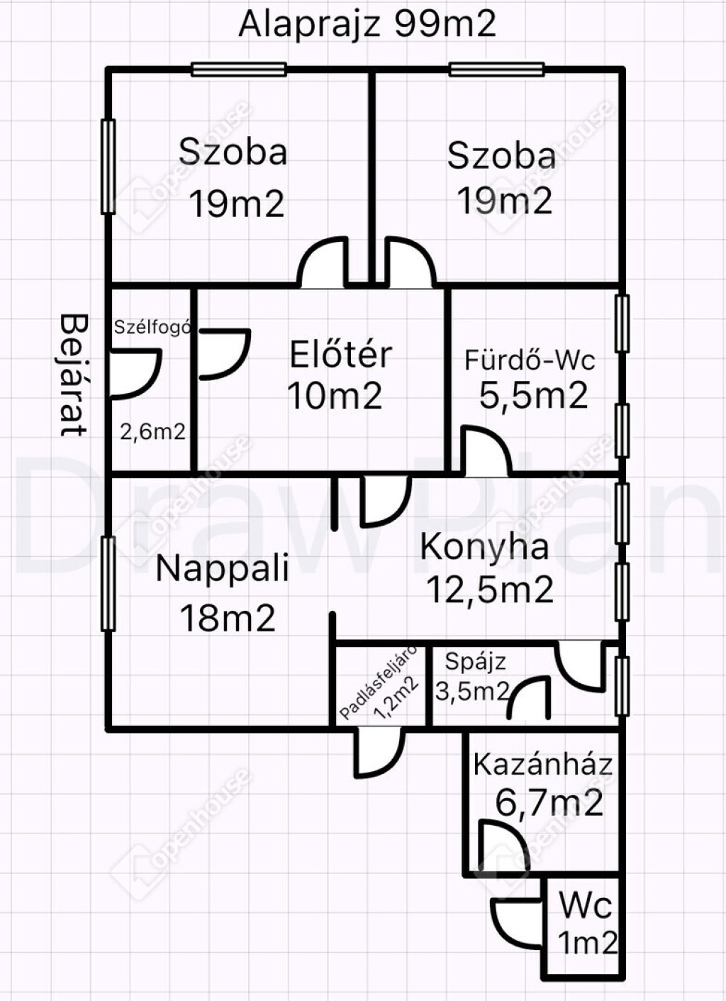 -Helyiségek 99m2 alapterületen: kettő szoba, nappali, fürdő-wc, konyha-étkező, spájz, előtér, szélfogó, külön wc, kazánház, padlásfeljáró.