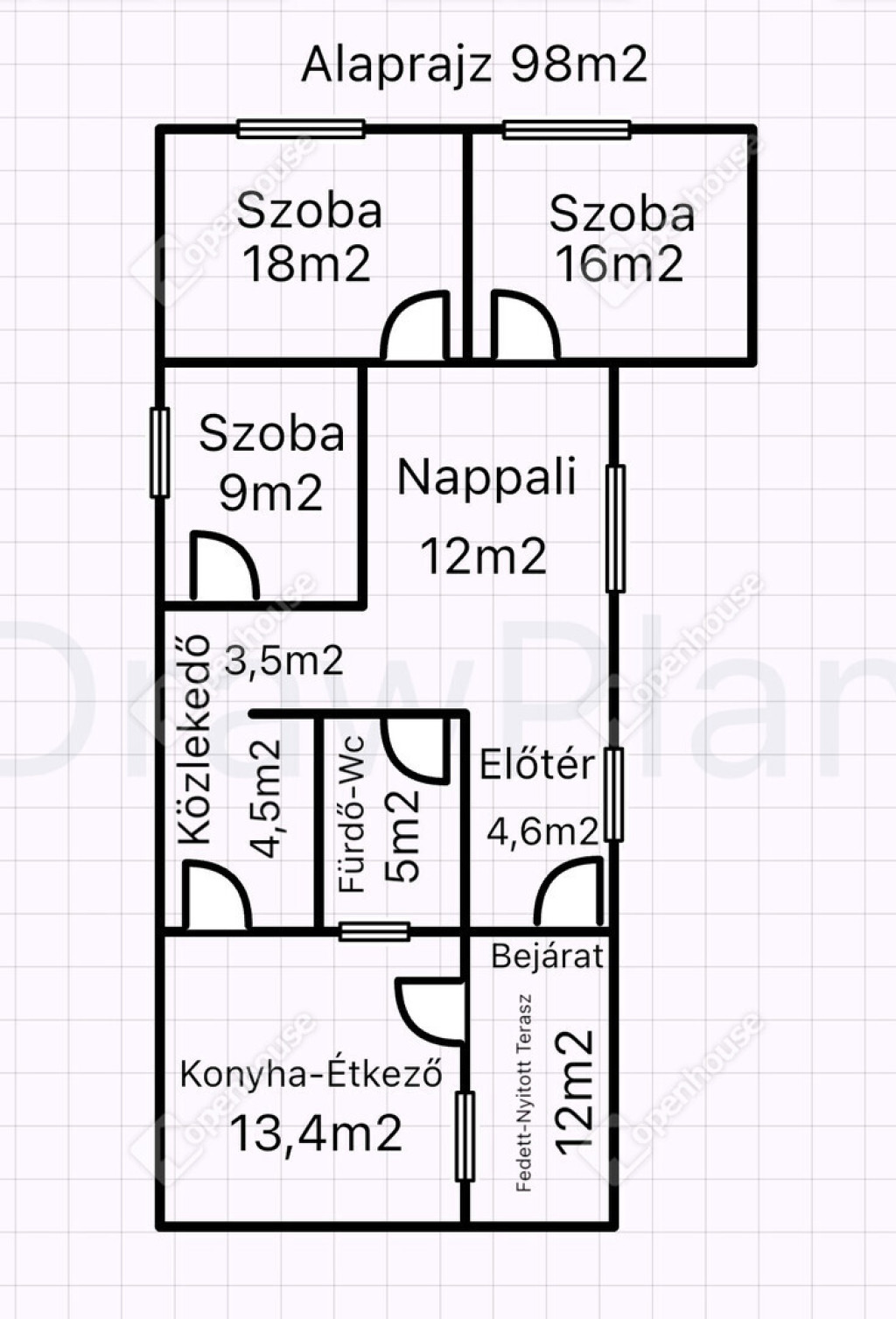 -Helyiségek 98m2 alapterületen: három szoba, nappali, fürdő-wc, konyha-étkező, előtér,közlekedő, fedett nyitott terasz, pince.