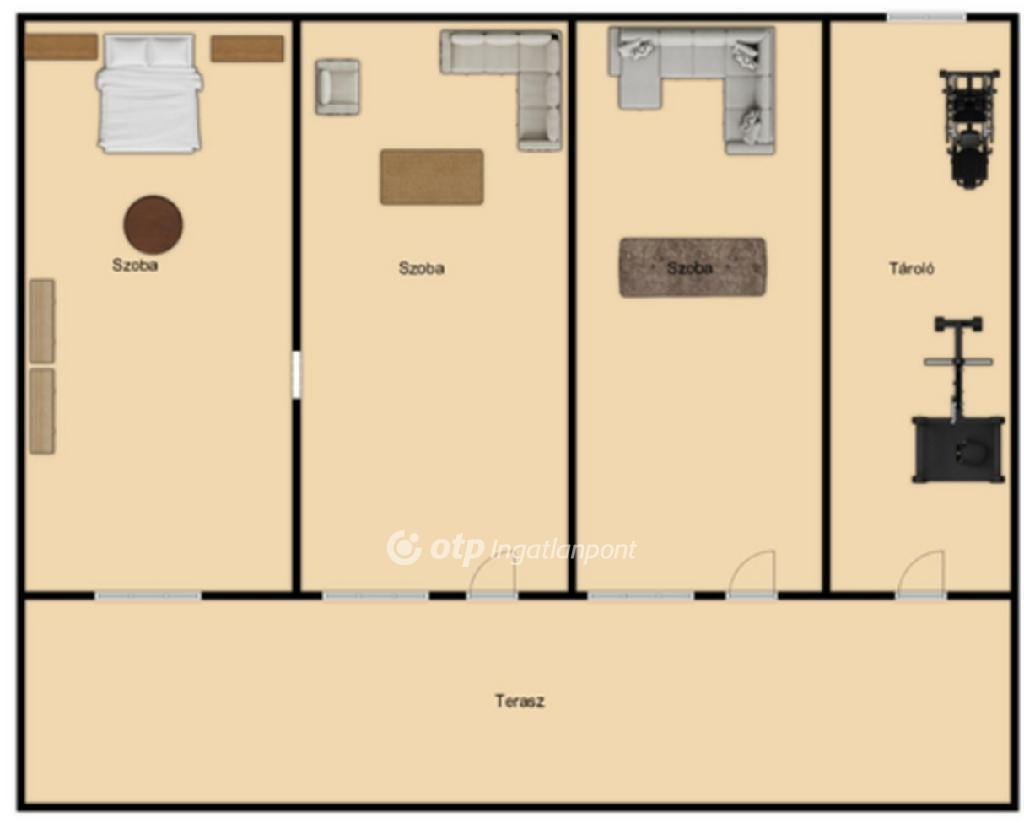 -3 külön nyíló helyiségben 1 szoba + konyha , szoba , tárolóegység és terasz került kialakításra.