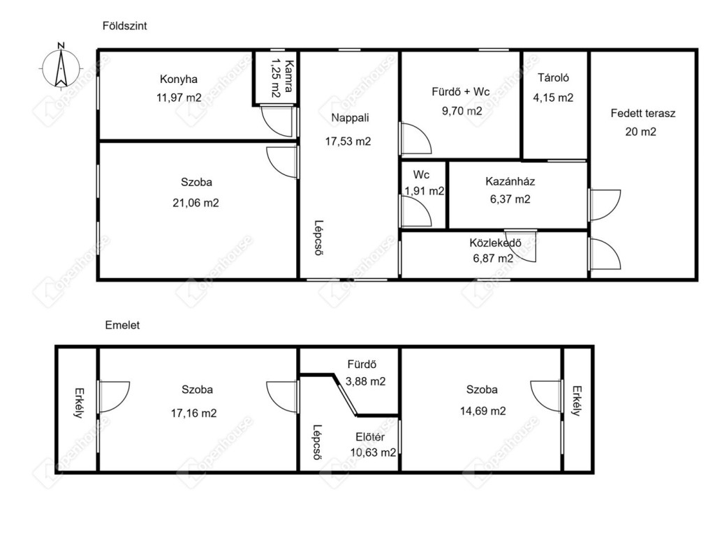 emeleten: 2 tágas szoba, 2 erkély, előtér, fürdőszoba helyiségekkel rendelkező, folyamatosan karbantartott családi ház.