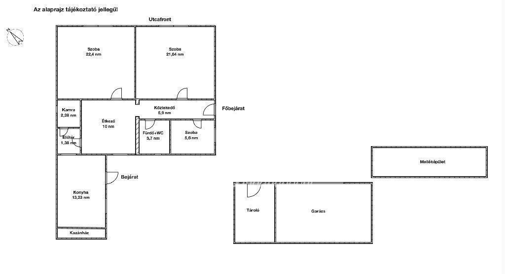 2 nagy szoba + 1 félszoba, külön étkező és konyha, garázs az udvarban