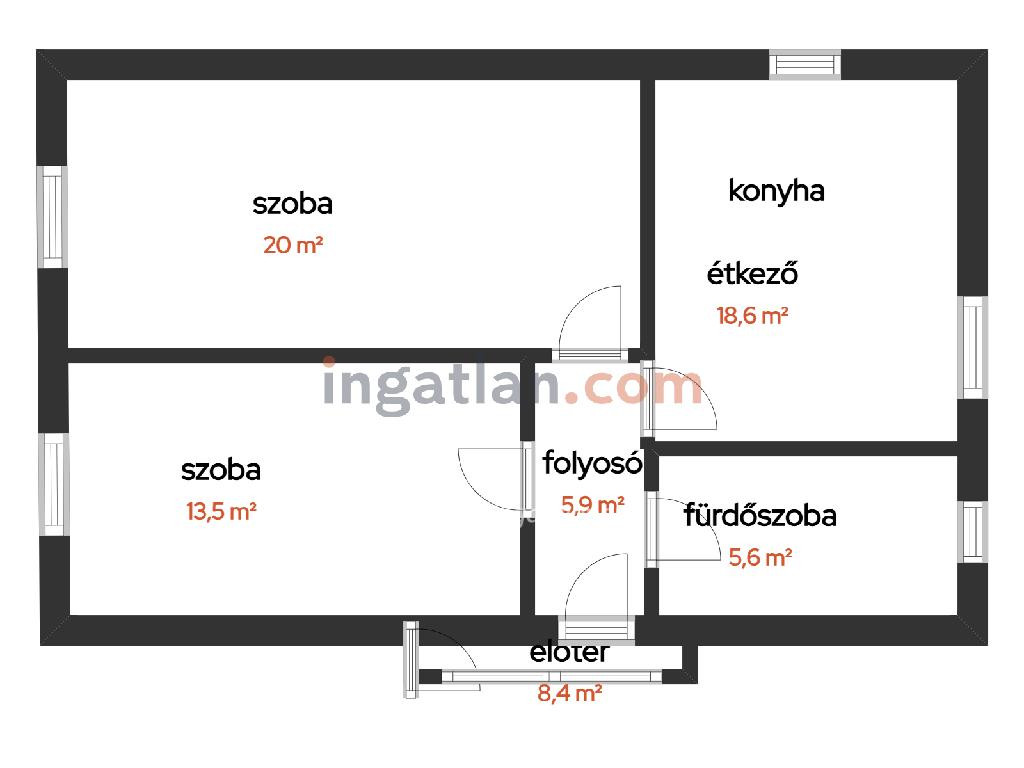 Helyiségek: amerikai konyhás nappali, étkező, 2 szoba, fürdőszoba (WC-vel egyben), közlekedő, előszoba.