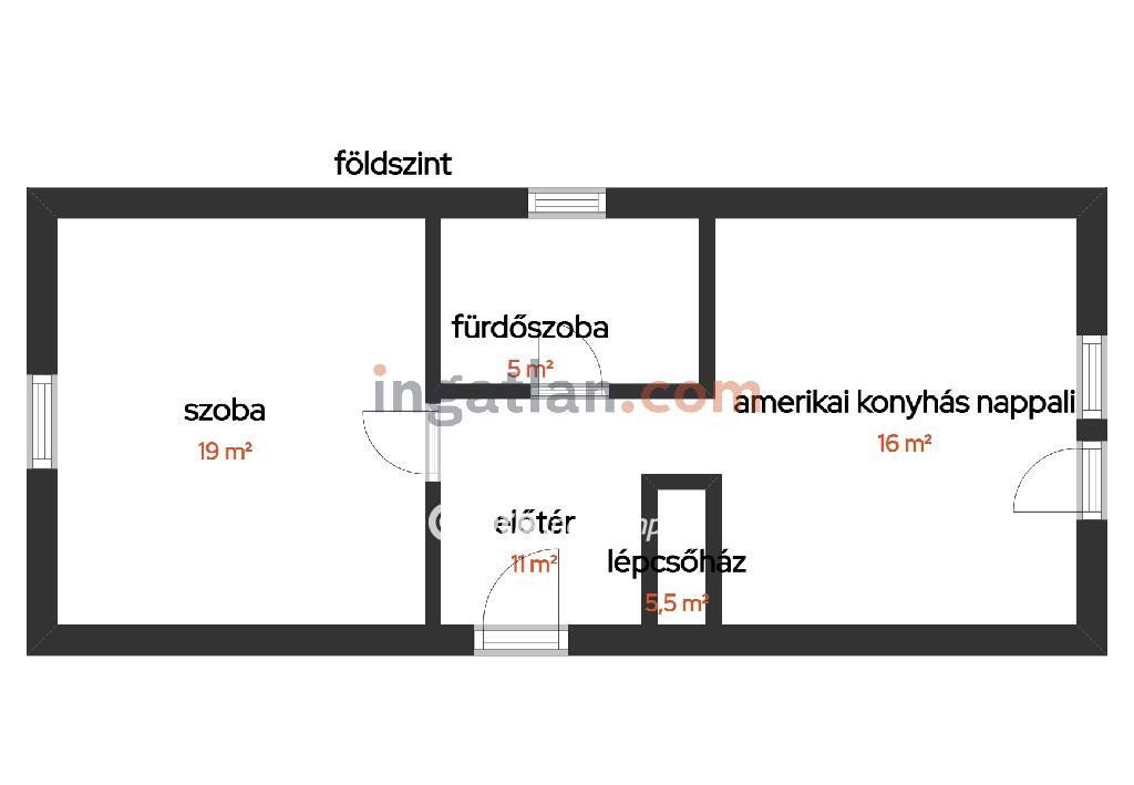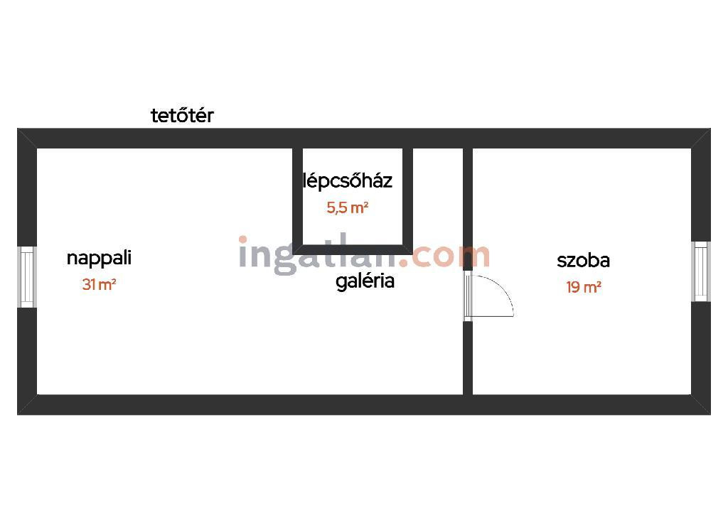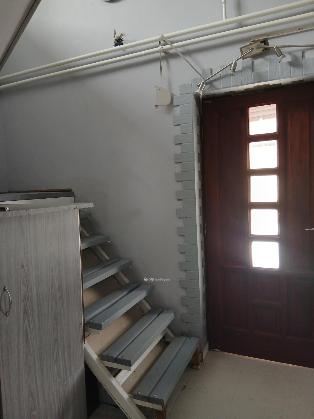 Helyiségek: földszint: amerikai konyhás nappali, szoba, fürdőszoba, WC egyben, közlekedő, előszoba; tetőtér: 2 szoba, van egy hálószoba és egy nappali egyben galériarésszel, nincs lefalazva a lépcsőfeljáró.