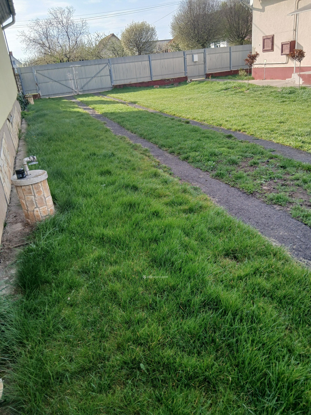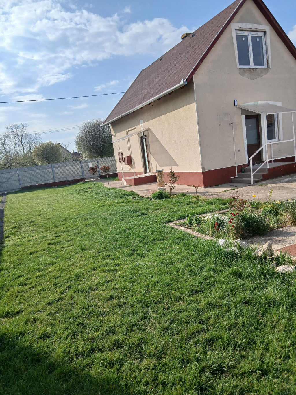 A telek: 886 m2, körbekerített, rendezett, szabályos formájú.