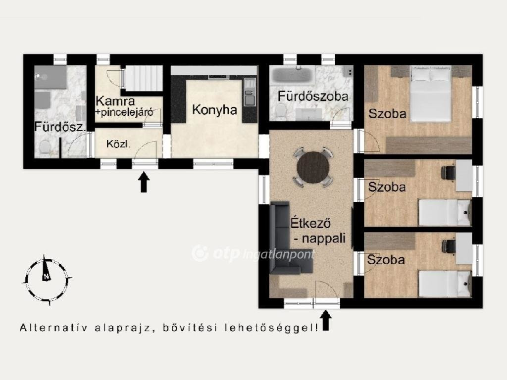 Ez az épületrész azonban közvetlenül hozzányitható a főépülethez, ezzel növelve annak lakóterét! A képek között található egy ALTERNATÍV ALAPRAJZ is egy bővítési megoldással, mellyel igény szerint, kb. 20 m2-rel lehet megnövelni a hasznos alapterületet.