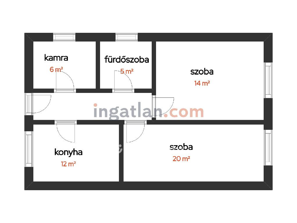 Helyiségek: konyha étkező egyben, 2 szoba, fürdőszoba (WC-vel egyben), közlekedő, előszoba, kamra.