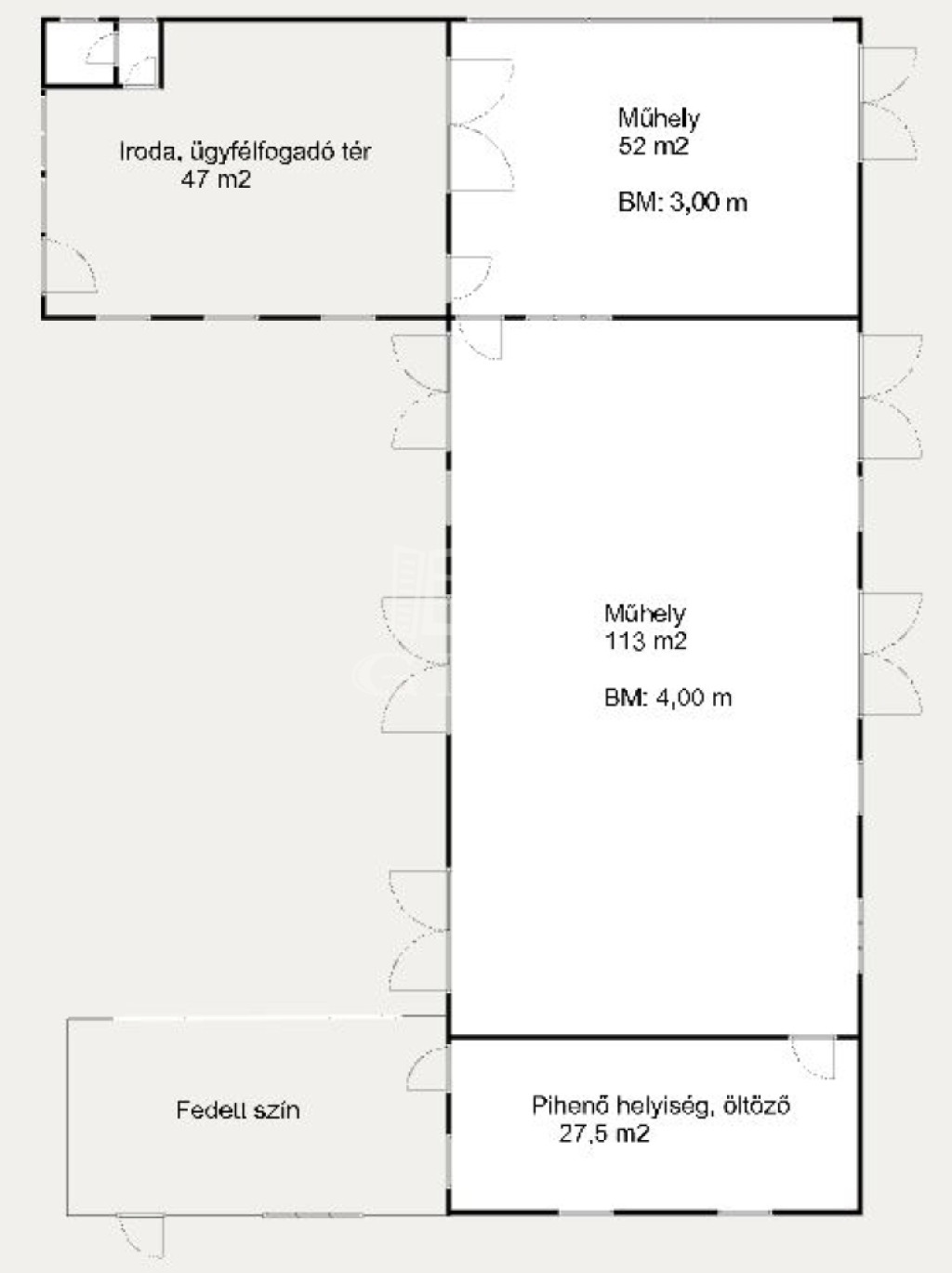 A műhely egy 47 m2-es iroda és ügyféltérből , egy 3 méter belmagasságú, 52 m-es és egy 4 méter belmagasságú 113 m2-es műhelyből és egy 27 m2-es pihenő, öltöző részből áll.