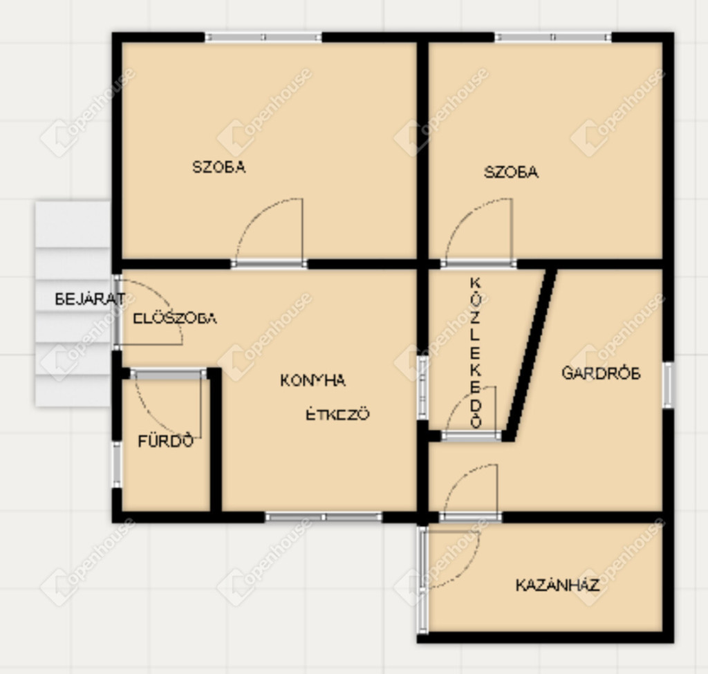 belső terek kialakítása jelen állapotában: előszoba, fürdőszoba, konyha-étkező, két külön nyíló kényelmes méretű szoba, közlekedő, fél szoba