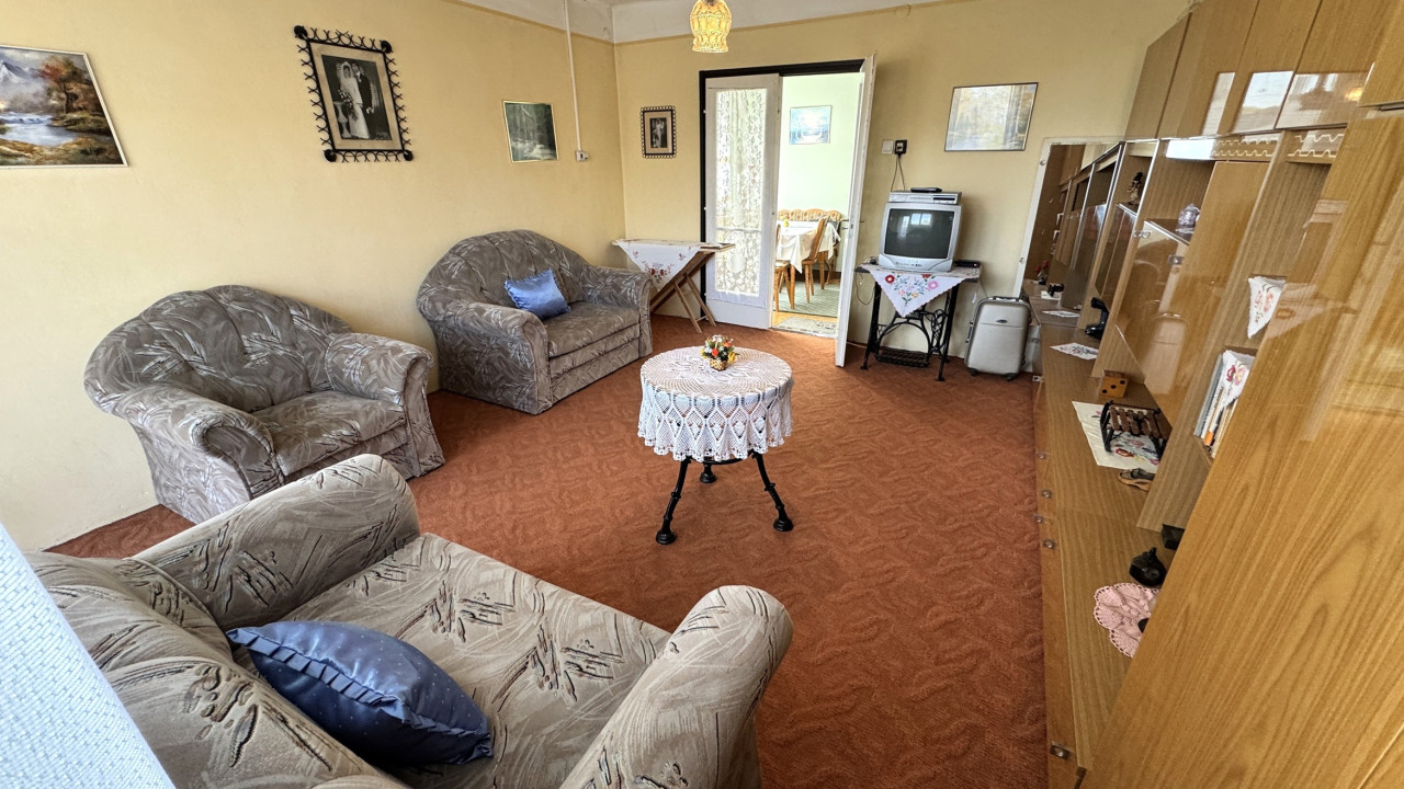 Sofa fa nyílászárók, redőnyökkel felszerelt.