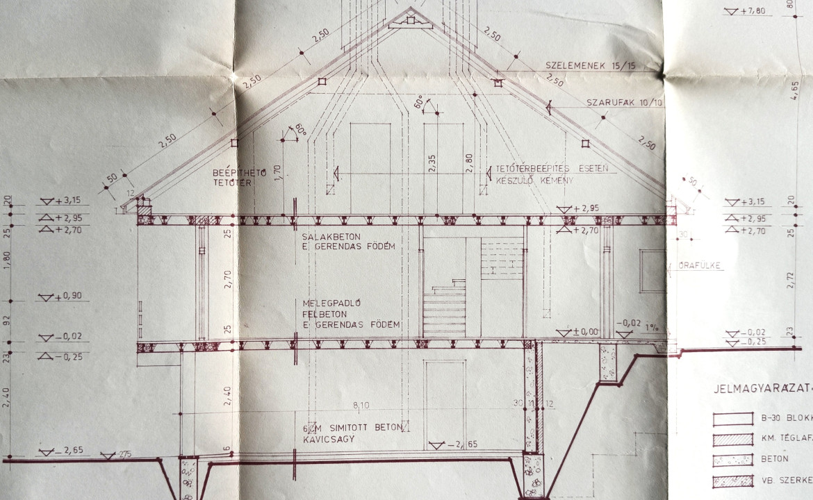 Építés és anyagok: stabil beton alappal, 1985-ben B-30-as téglából épült, cserép fedésű.