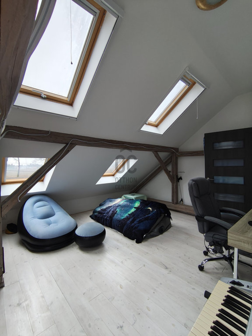 Beépített, fagerendás tetőtérrel bővült a ház, ahol egy nagy méretű hálószoba és fürdőszoba került kialakításra.