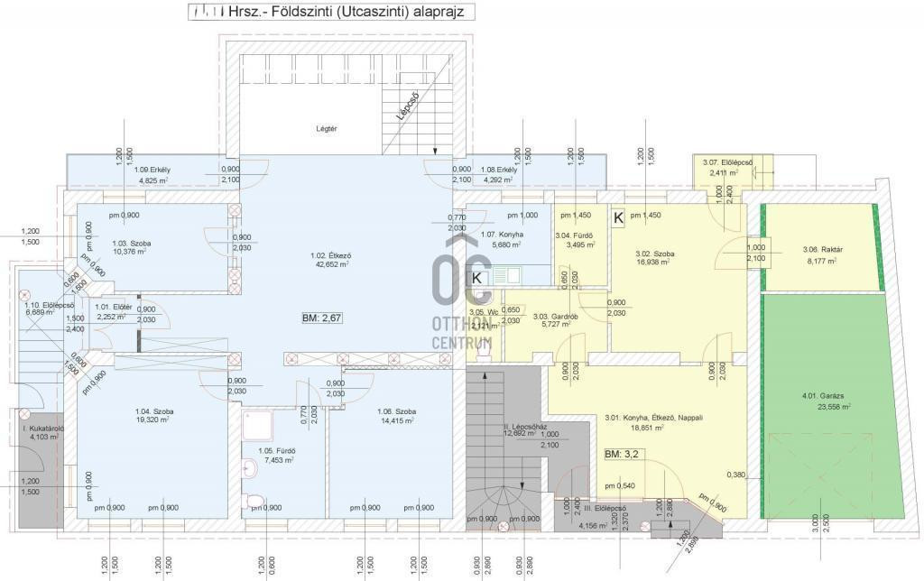 - Ezeken kívül egy közlekedő, raktár, terasz lett leválasztva, 33,2 m2 nagyságban, illetve egy garázs, ami 23,6 m2.