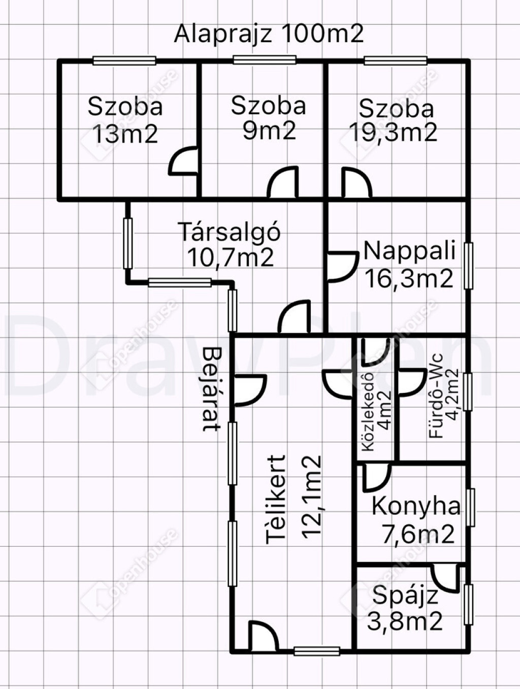 -Helyiségek 100m2 alapterületen: három szoba, nappali, konyha, spájz, fürdő-wc, közlekedő, társalgó, télikert. Telek területe: 1317m2.