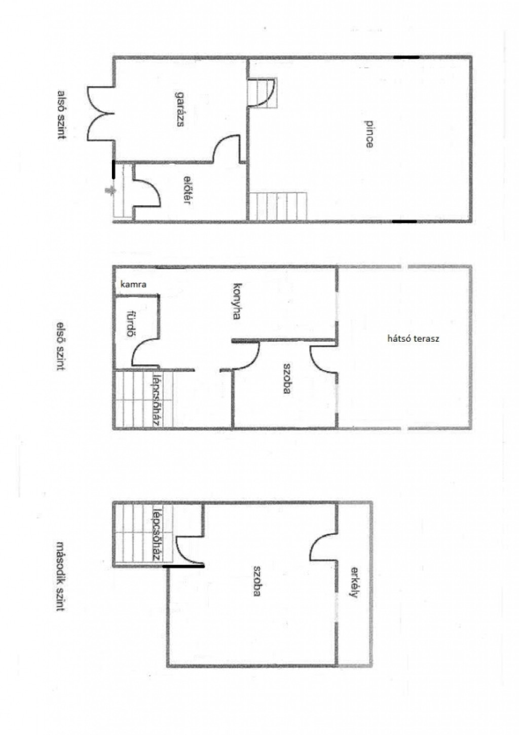 Az épület alapterülete 60 m². A pince felett, az alapszinten található a garázs és a lépcsőházi bejárat. Az első félszinten konyha kamrával, egy különálló – jelenleg gardróbként használt, de igény szerint egybenyitható – szoba, valamint zuhanyzós fürdőszoba toalettel kapott helyet. Néhány lépcsővel feljebb egy 32 m²-es, világos nappali található, melyhez a ház teljes homlokzatán végigfutó erkély kapcsolódik.