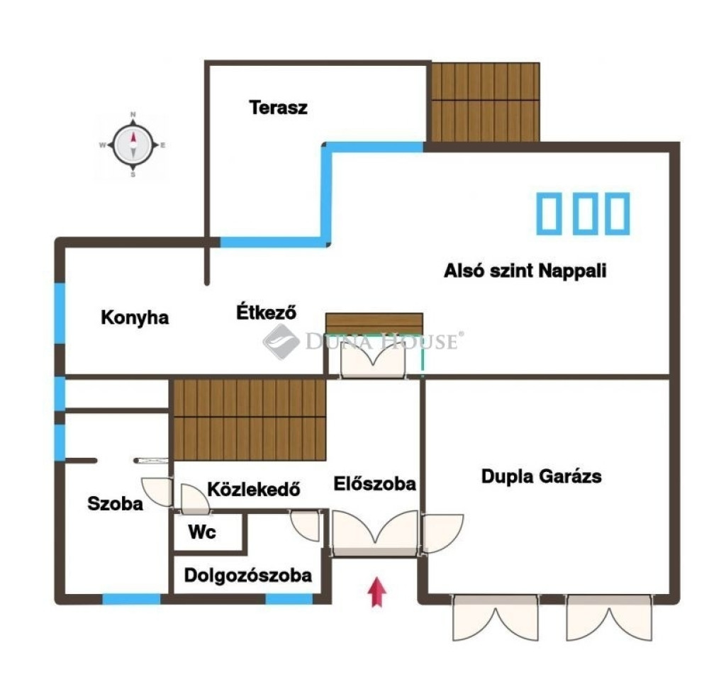 - Csak utcai oldalról pince, a telek lejtéséből adódóan az udvar felől közvetlen kertkapcsolatos ez a szint