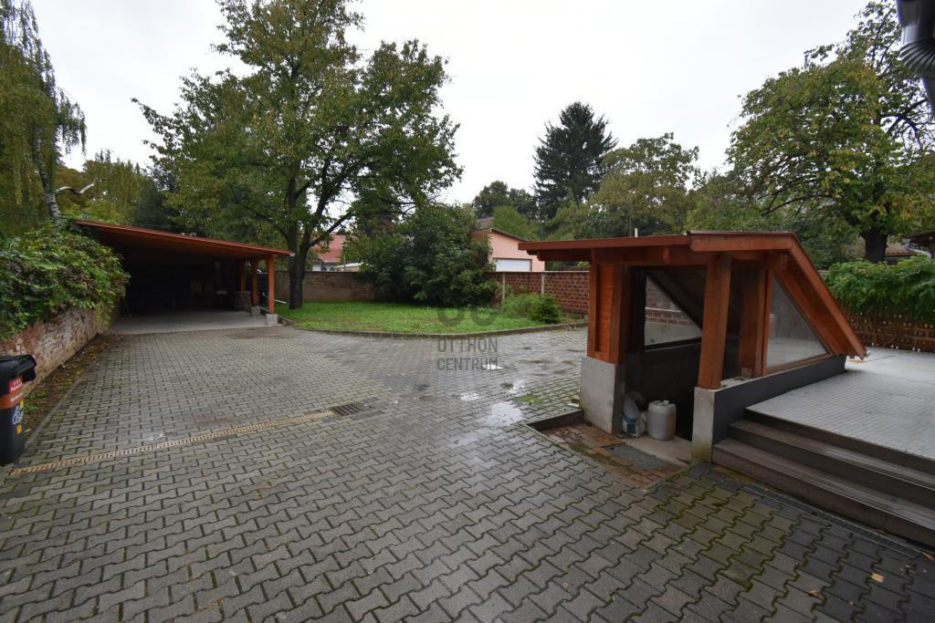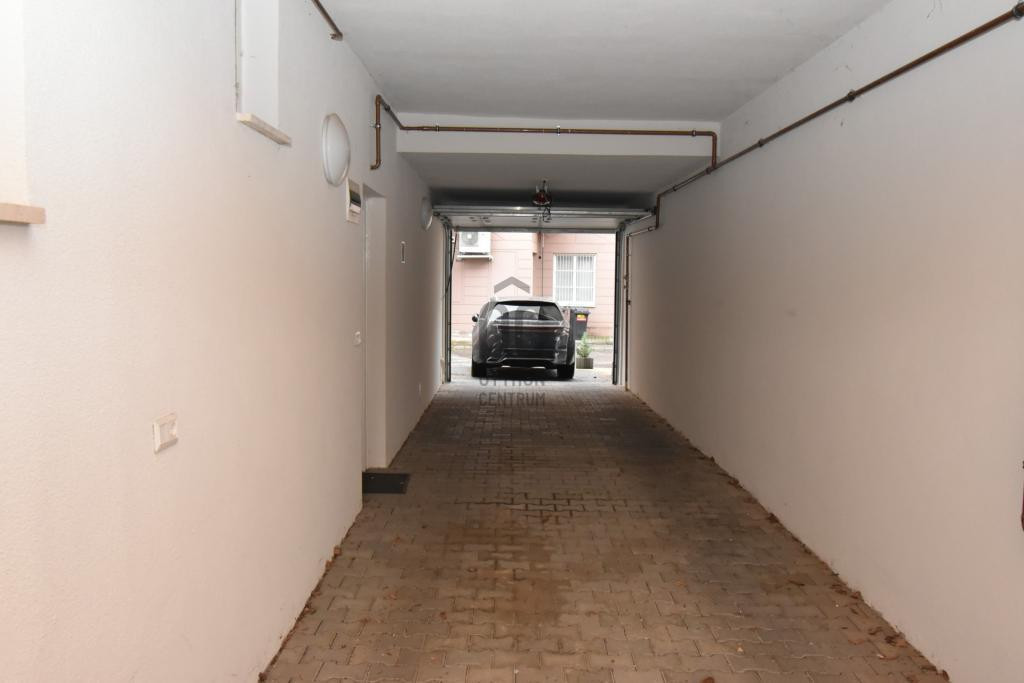 A garázsajtón keresztül egy fedett kapubejáróba jutunk (33 m2), amelyen keresztül érhetjük el a belső kertet, ahol egy 43 m2-es fedett gépkocsibeálló került kialakításra.