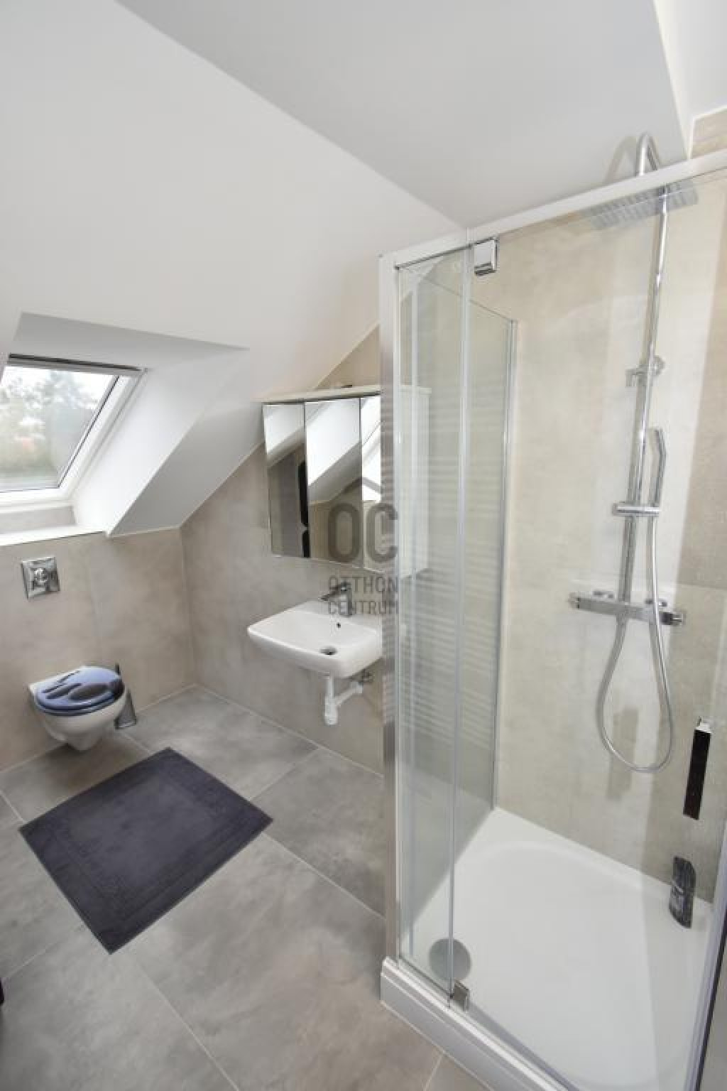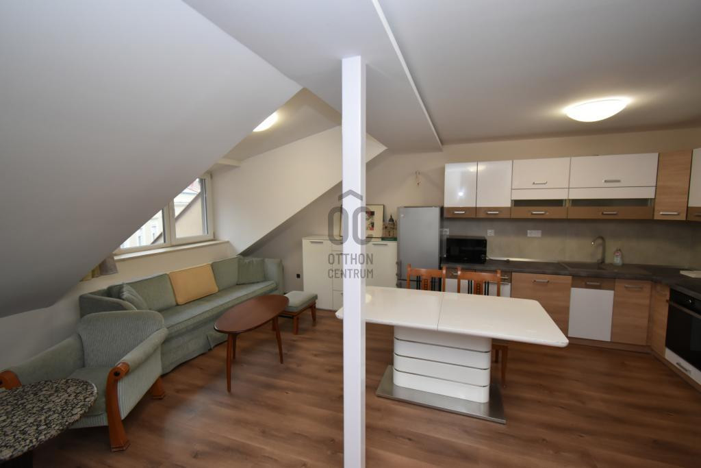 A tetőtéri lakrész 82 m2-es, ahol nappali + konyha + étkező, 2 db szoba, 2 db fürdő + WC, előszoba, tároló helyezkedik el.