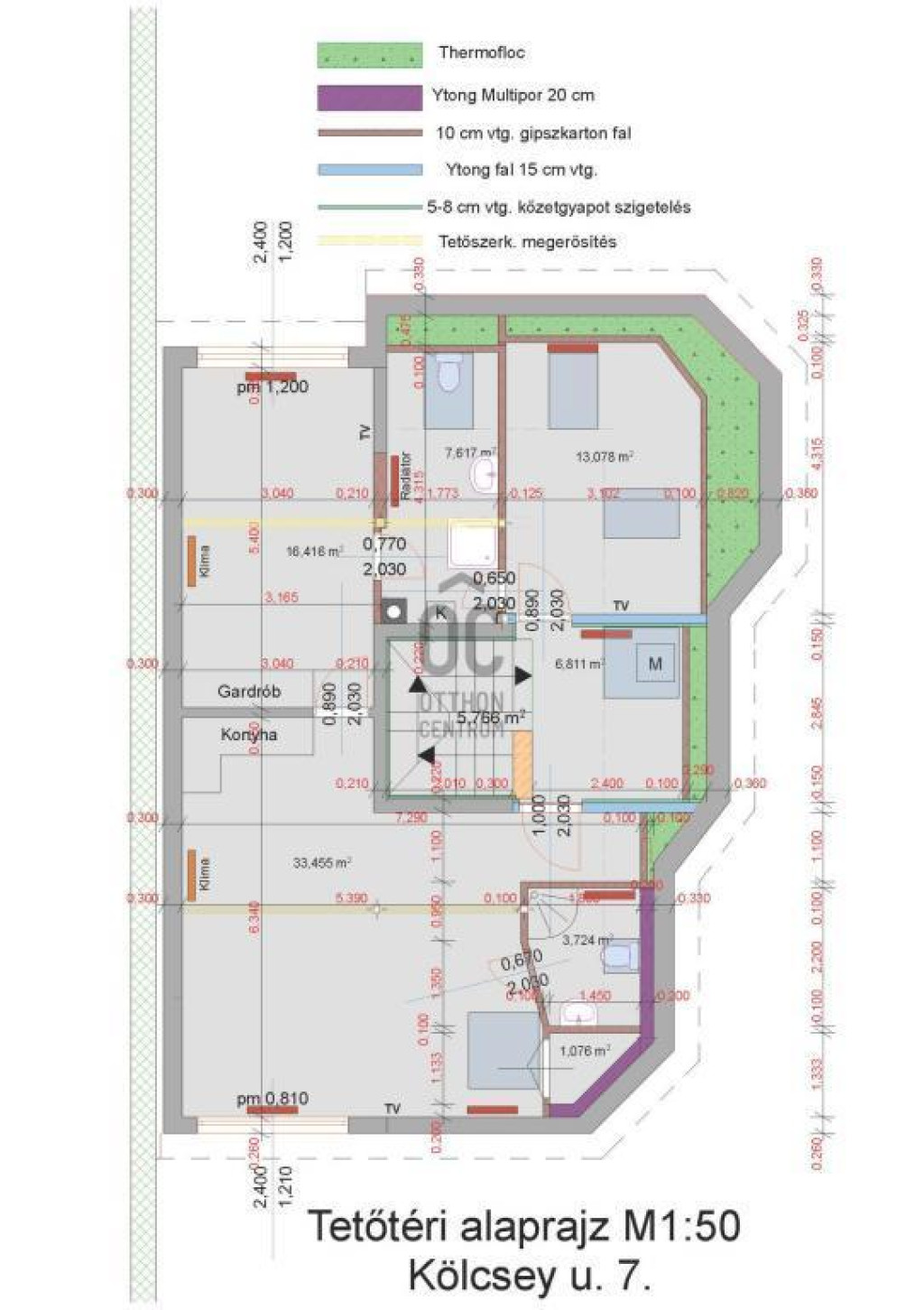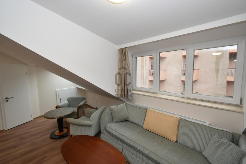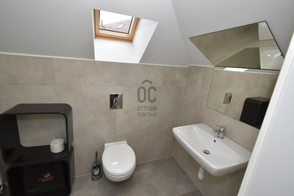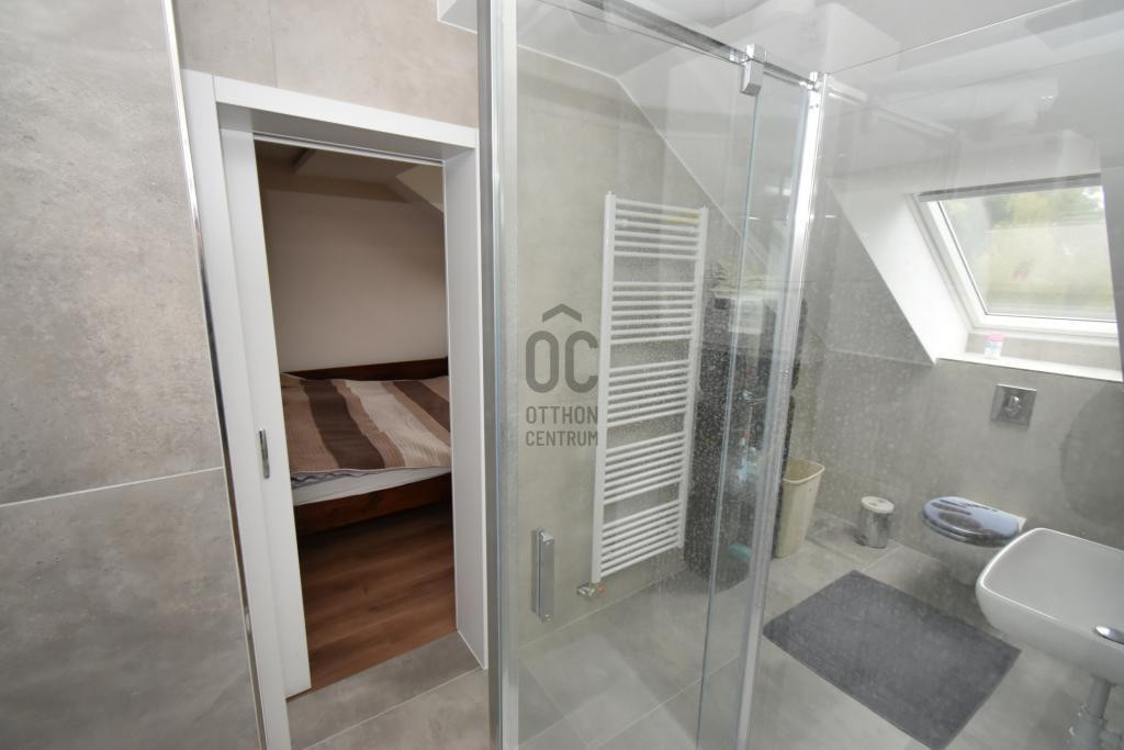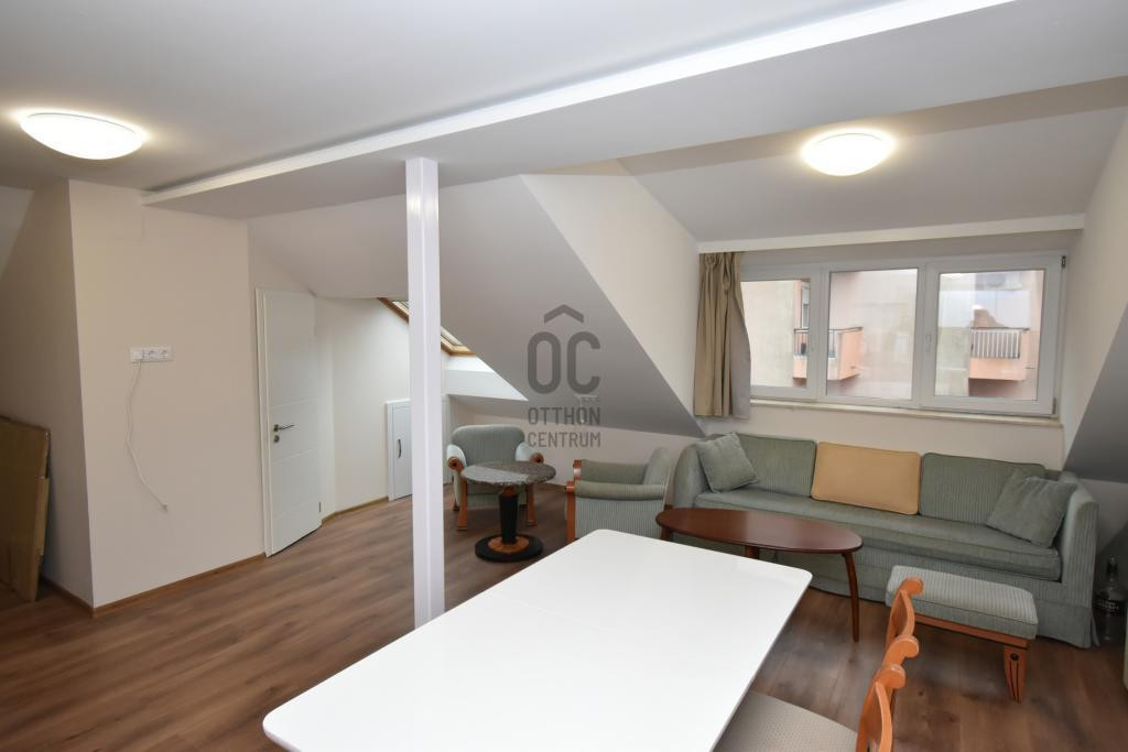 A tetőtéri lakrész 82 m2-es, ahol nappali + konyha + étkező, 2 db szoba, 2 db fürdő + WC, előszoba, tároló helyezkedik el.