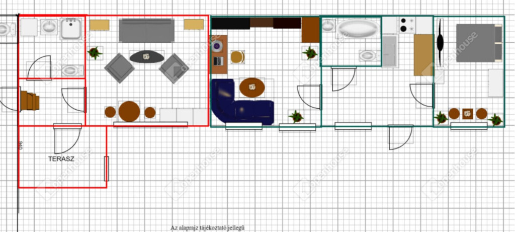 Három különálló lakrész, mindegyik saját vizes helyiséggel