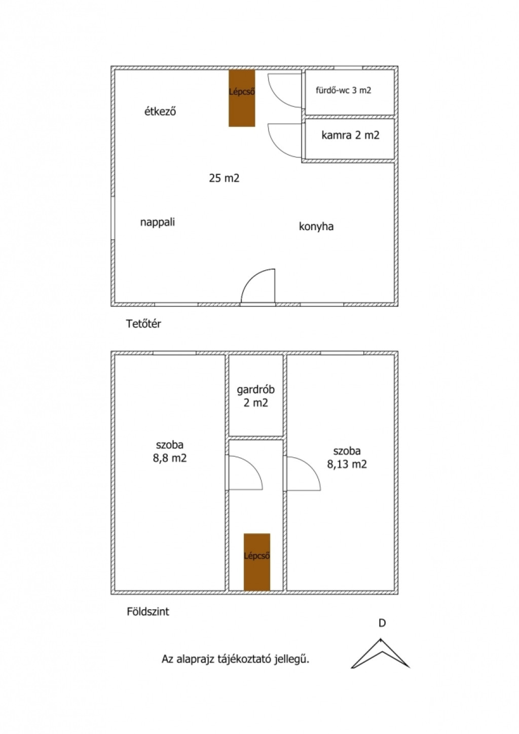 - helyiségei: földszinten- nagyobb amerikai konyhás étkező- nappali, kamra, fürdő-wc, közlekedő, ahonnan belső lépcsővel jutunk a tetőtérbe- 2 szoba, közlekedő biztosítja a kényelmet lakói számára