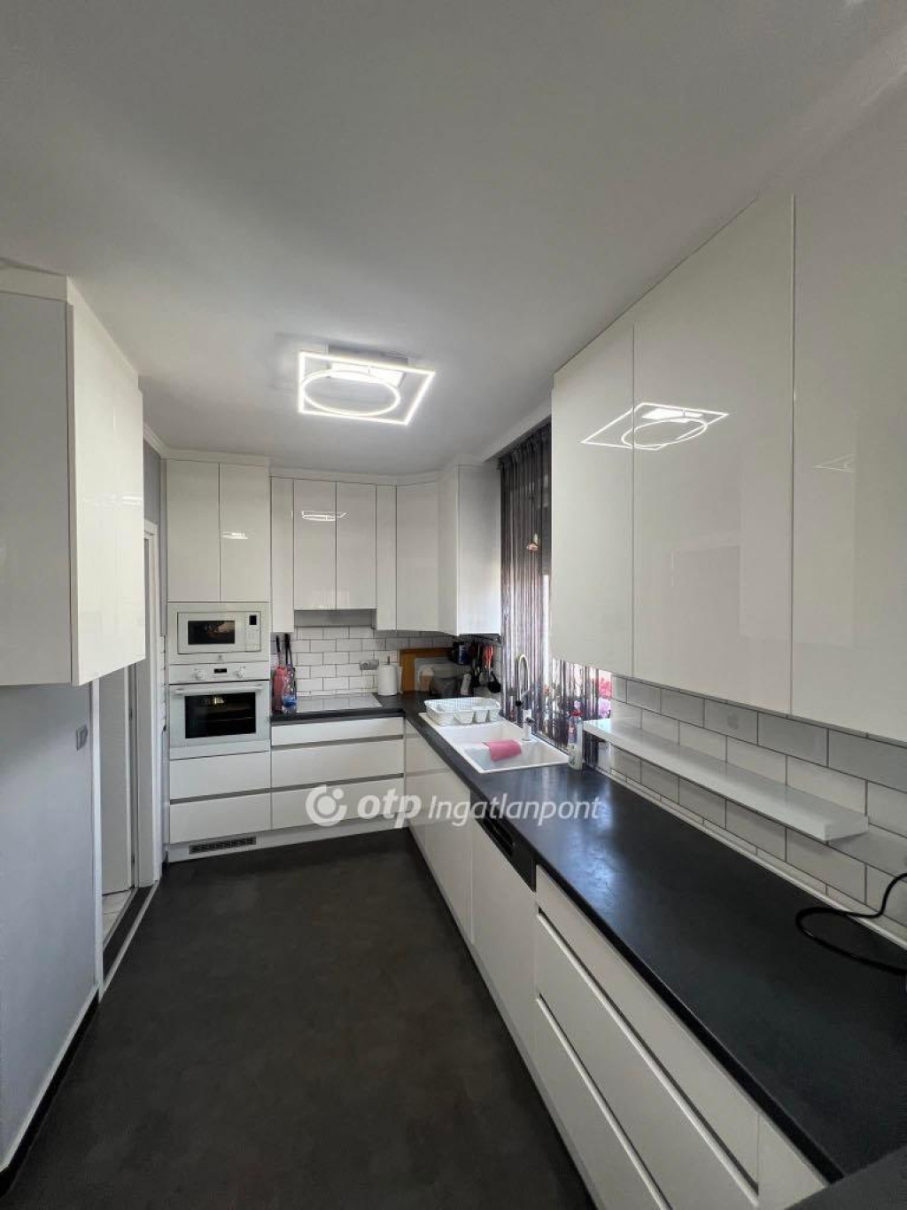 A konyha: modern, letisztult, fehér fényes szekrényekkel ellátott, beépített elektromos sütővel és mikrohullámú sütővel, amely elegáns megjelenést biztosít.