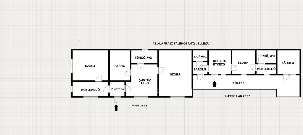 Az első házrész kb. 65 m2 alapterületű, 2,5 szobával és tégla alapzatú, 60 cm vastag vályogfalazattal rendelkezik, míg a hátsó, téglaépítésű lakrész kb. 35 m2-es. Igény esetén a két épületrész egybenyitható, így könnyedén alakítható nagyobb család számára is.