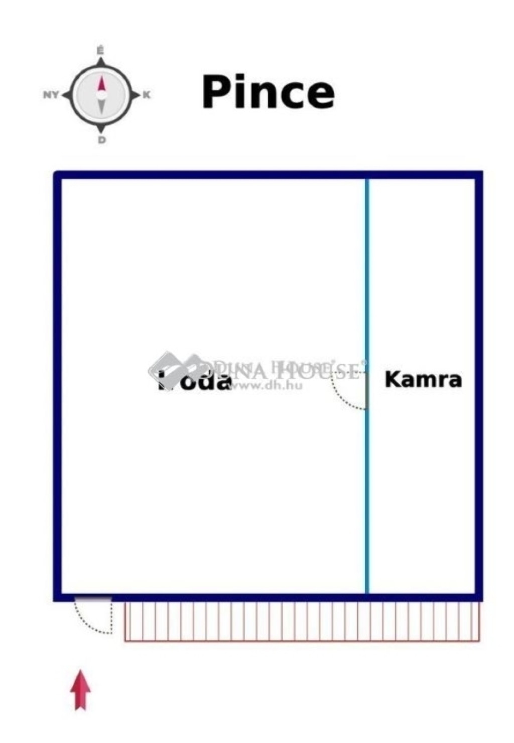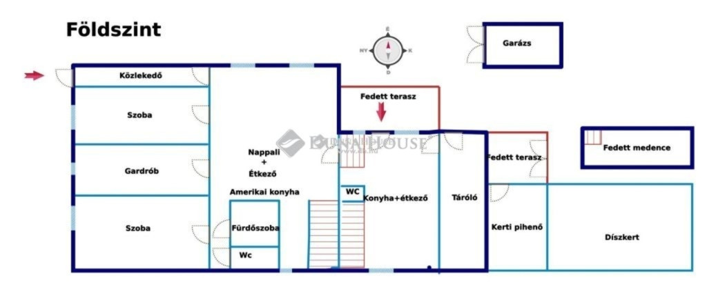 - fedett teraszról: külön konyha + étkező, WC, tároló, innen pince lejárat