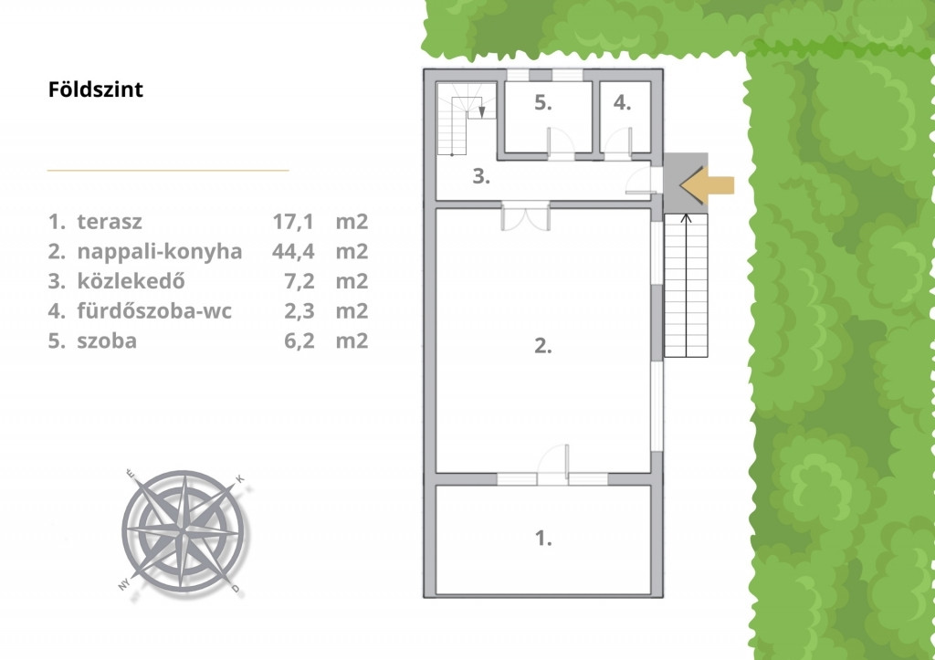 - A FÖLDSZINTEN található a közel 45 m2-es amerikai konyhás nappali + innen nyíló 17 m2-es terasz, ami kényelmes életteret nyújt a családnak.