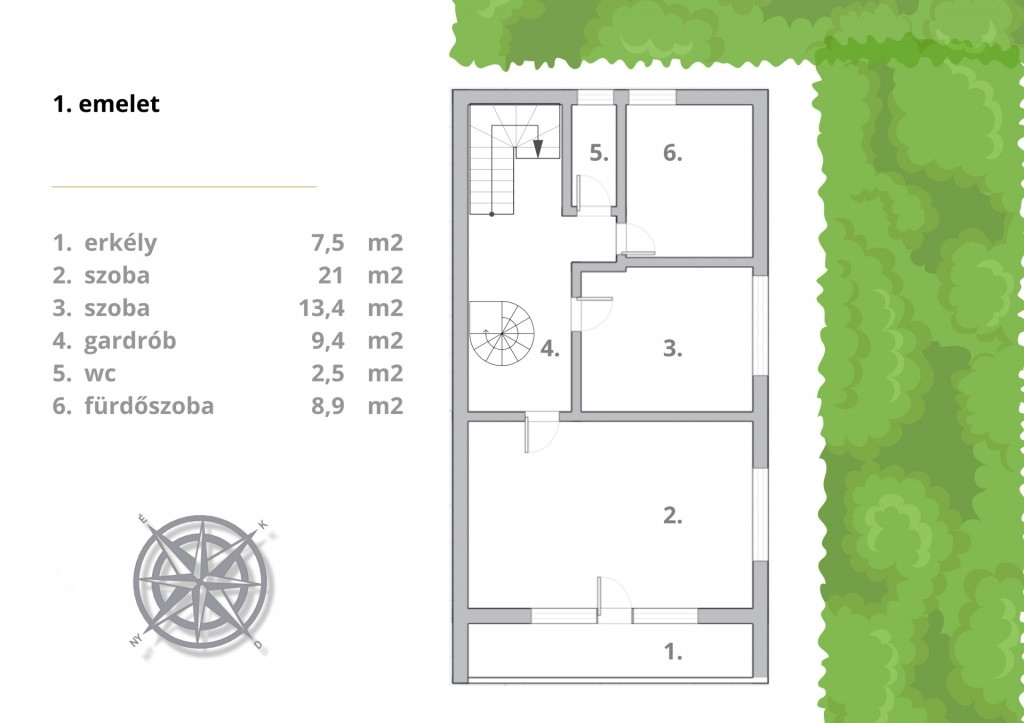 - Nappali + 5 hálószobás, 2 teraszos, garázzsal, tárolóval, kazánházzal, előkerttel és hátsó udvarral rendelkezik.