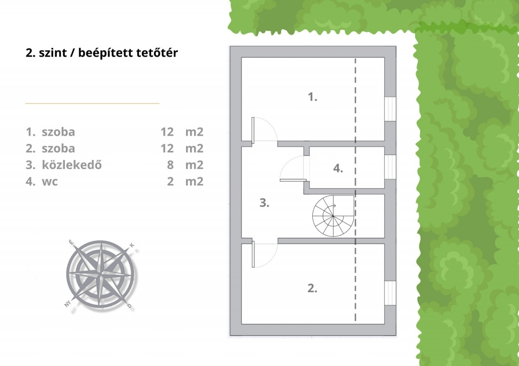 - A BEÉPÍTETT TETŐTÉRBEN van még 2 hálószoba beépített szekrényekkel és egy wc helyiség.