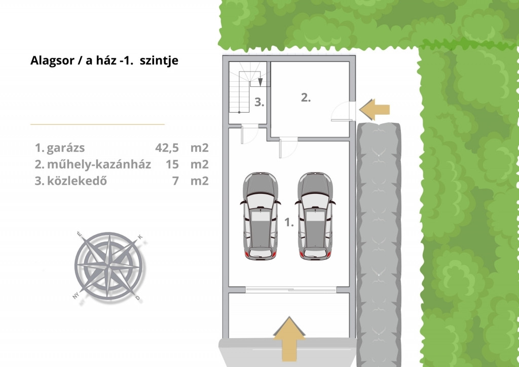- Az ALAGSORBAN található a garázs, ahol akár 4 autó is tud parkolni kényelmesen, továbbá a kazánház és egy műhely-tároló helyiség.