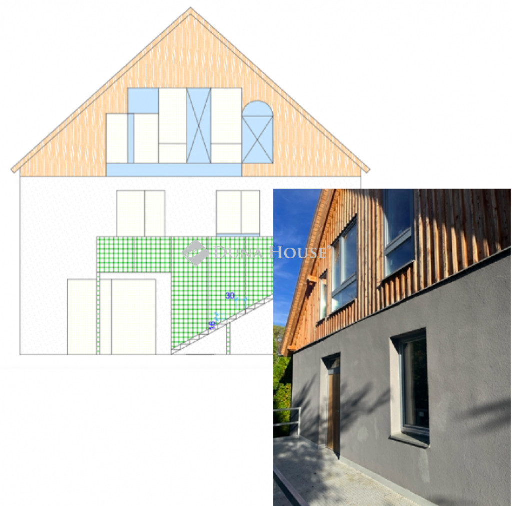 Ez a háromszintes, összesen 260 m²-es téglaépület a nyugodt, zsákutcás Nagykovácsi Ófaluban található. Ebből 160 m² a lakótér, a fennmaradó területet a garázs és a tárolók teszik ki. A ház jelenlegi kialakításában két külön lakásból áll, de akár egybefüggő családi házként is használható sőt, az alsó szinten iroda vagy egy harmadik lakás is kialakítható.Alsó szint garázs és tárolók. Az alsó szinten kb. 98 m² található, amelyben egyállásos garázs és több tároló kapott helyet. Az elrendezés lehetőséget ad arra, hogy itt akár egy önálló lakás vagy iroda is létrehozható legyen.Középső szint nappali + 2 háló + 2 fürdő. A kb. 100 m²-es középső szint jelenleg lakásként funkcionál. A tágas nappali, a különálló konyha, valamint két hálószoba és két fürdőszoba ideális elosztást kínál család számára.Tetőtér külön bejárattal, amerikai konyhás nappali + háló. A felső szint külön bejáraton keresztül közelíthető meg, így önálló lakásként is működhet. A kb. 65 m²-es tetőtérben egy amerikai konyhás nappali, egy hálószoba, egy fürdőszoba és egy külön WC található praktikus és hangulatos kialakítással.Felújítás és műszaki tartalom.