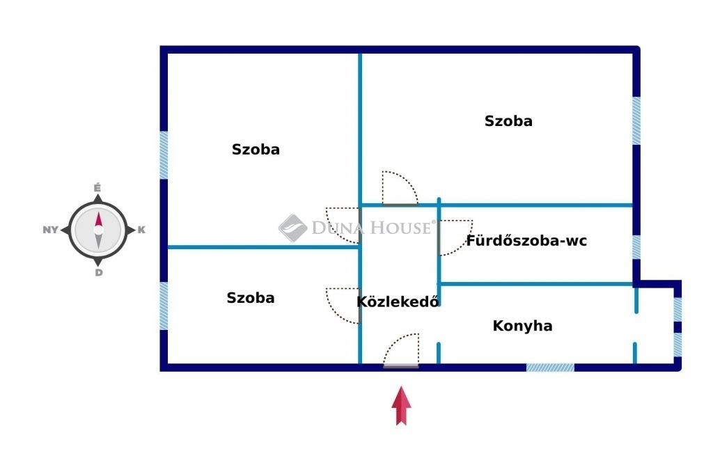 - nappali+ 2 szoba, melyek mindegyike külön nyílik, konyha-étkező, fürdőszoba és wc helyiségekből áll