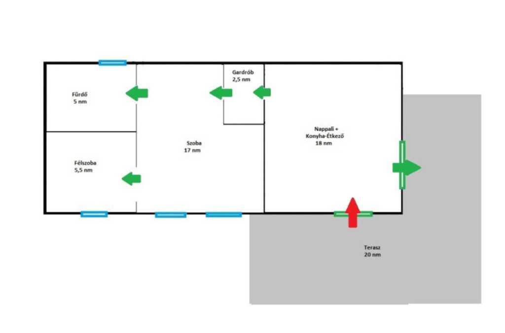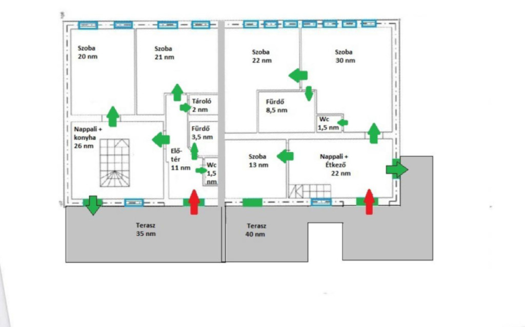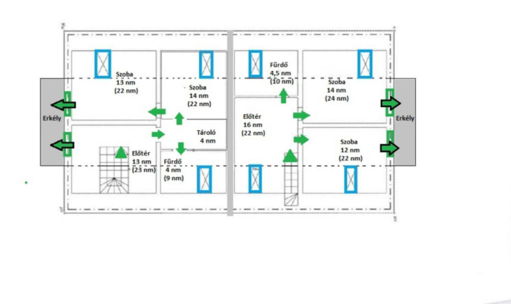 A tetőtérben lévő ferde falsíkok 1,9 m alatti részei nincsenek benne a hirdetésben feltüntetett nagyságban, bár igen jól kihasználhatóak, nem nyúlnak el. 40-40 nm-t ad a hasznos lakótérhez.