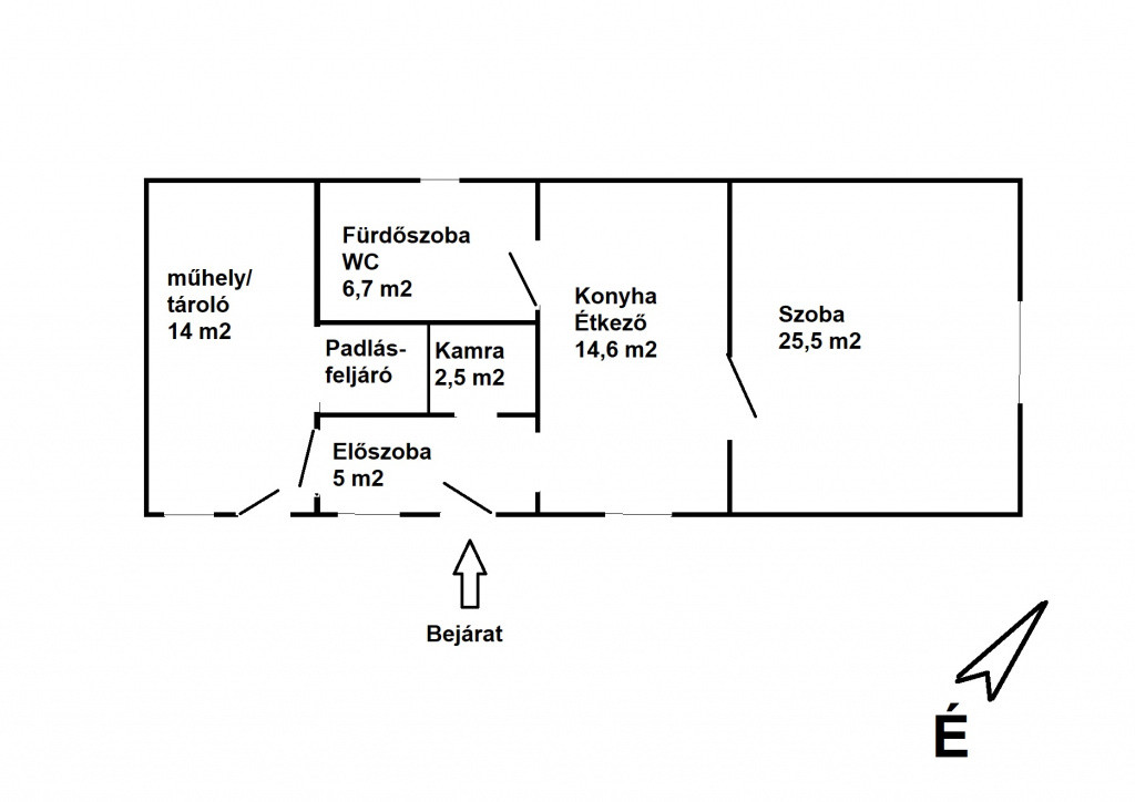 A ház 54 m²-es lakóterülettel rendelkezik, és kiváló állapotú vályogtéglából épült. A sima felületű falak téglaház benyomását keltik, miközben a 50 cm vastagságú szerkezet kiváló hőszigetelést biztosít, télen melegen tart, nyáron hűvösen. A földszintes épület praktikus elrendezésű: egy tágas, 25,5 m²-es szoba, egy étkezős, 14,6 m²-es konyha, valamint egy 6,7 m²-es, ablakos fürdőszoba, ahol akár kád is elfér. Minden ablak hőszigetelő, műanyag kivitelű, így a komfortérzet egész évben adott.