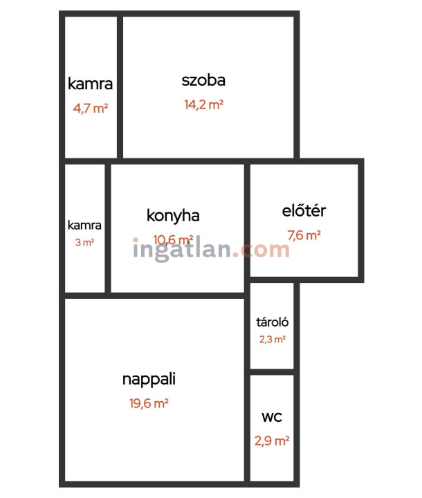 Az ingatlan előszoba, két hálószoba, kézmosós WC („fürdőszoba”), kamrák, tároló elosztású.