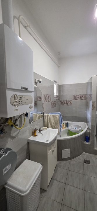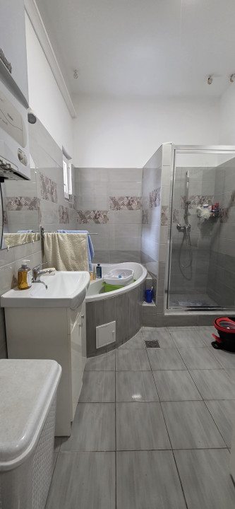 A modernizált fürdőszobában sarokkád és zuhanyzó is helyet kapott, így minden igényt kielégít.