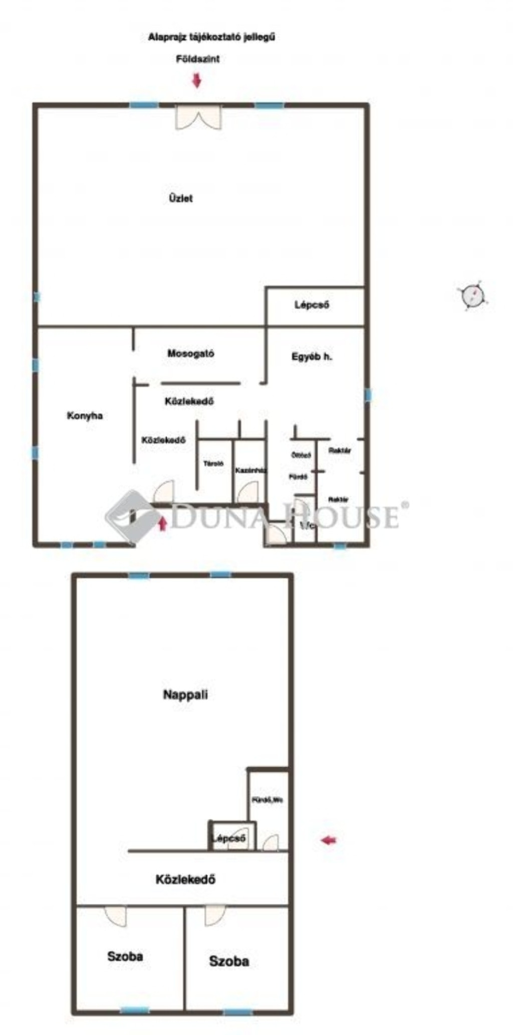 Földszinten egy üzlet működik kiegészítő helyiségekkel, az emeleten egy lakás található nappalival, fürdő wc-vel, 2 szobával és konyhahelyiséggel. Az emelet az utcáról közelíthető meg.