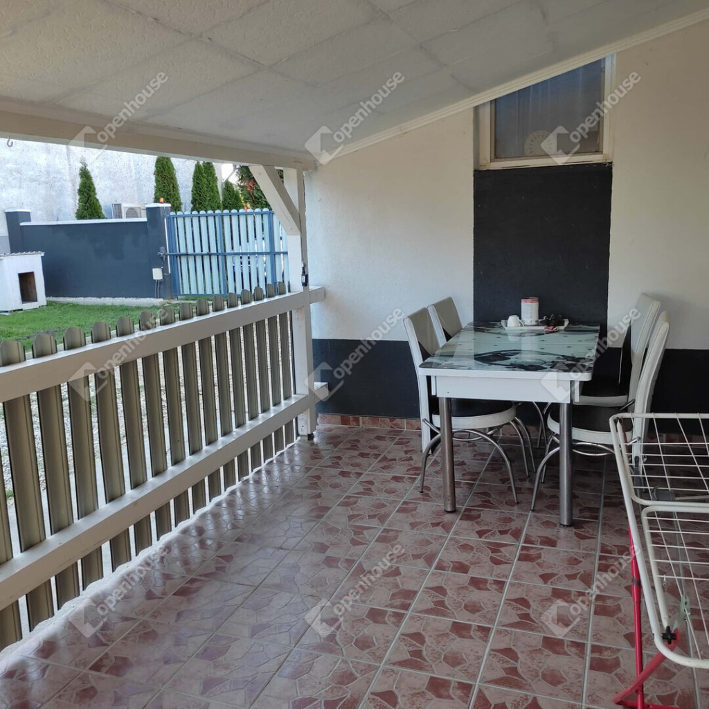 A ház bejárata előtt nagyméretű, hangulatos fedett terasz biztosítja a helyet a kinti programokhoz.