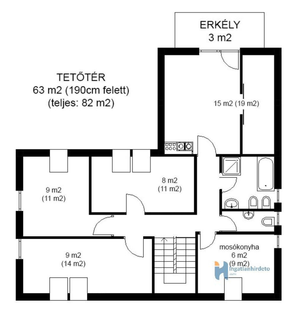 A tetőtérben található 4 szoba, egyhez tartozik egy gardróbszoba és egy erkély, továbbá található mosókonyha, fürdőszoba káddal, zuhannyal és WC-vel, külön WC, tárolóhelyiség. A tetőtér alapterülete 82m2, amelyből a 190cm-t meghaladó belmagasság területe 63m2.