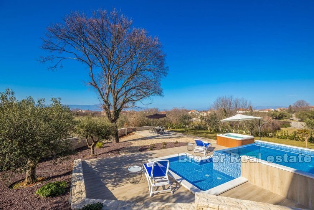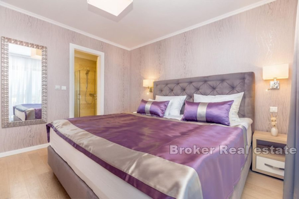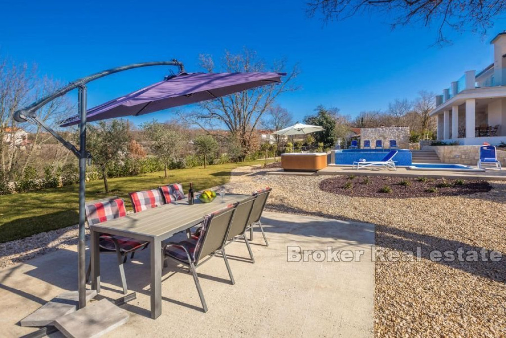 Detached house for sale on Krk, not far from Malinska. Total living area 281 m2, located on a plot of 1289 m2. The house is spread over a total of three floors. In the basement there is a bathroom and engine room, as well as two spacious rooms that offer the possibility of being decorated as a tavern with a fireplace and a space for recreation. The ground floor consists of an entrance hall, a kitchen with a dining room, a bedroom, a toilet, a bathroom and a large living room through which there is a direct exit to a beautifully decorated terrace. Upstairs there are three bedrooms, two bathrooms and two balconies with a panoramic view of the sea. In the beautifully landscaped garden there is a heated swimming pool with a sunbathing area, a jacuzzi and a space for relaxing and socializing with loved ones. During construction, only the highest quality materials were used, the house is equipped with air conditioners, underfloor heating in the bathrooms, PVC joinery with aluminum shutters. The house is sold fully furnished and superbly equipped. With its large garden, it ensures privacy and peace in a beautiful location on the edge of a green area with an idyllic view of the sea. BROKER REFERENCE ID:1023/03