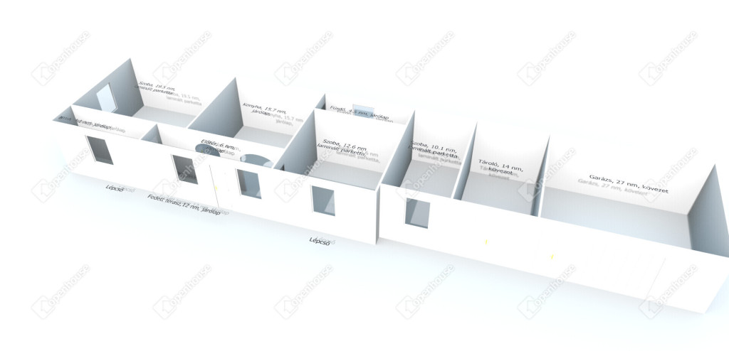 A ház folytatásában található egy nagyméretű tároló, és egy 27 négyzetméteres garázs.