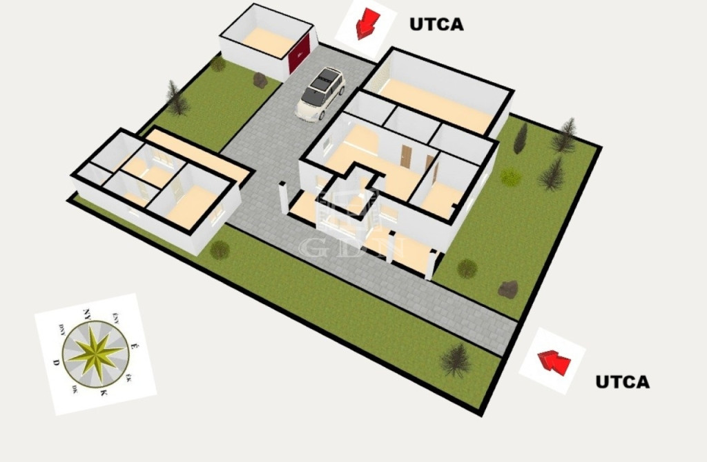ELADÓ Nyáregyházán, 535 m2-es telken, KÉT KÜLÖNÁLLÓ ÉPÜLETBŐL álló, összesen közel 100 m2-es ingatlan – SOKOLDALÚ HASZNOSÍTÁSI LEHETŐSÉGEKKEL. A két ház vegyes falazatú, a nagyobb 64 m2-es, 2+1 szobás, a kisebb 30 m2-es, 1 szobás ÖSSZKOMFORTOS.