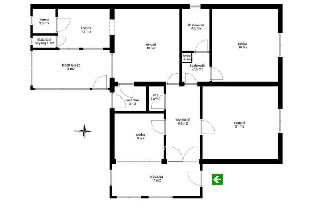 A ház elrendezése praktikus: tágas nappali, külön étkező, zárt napfényes veranda, fürdőszoba káddal és zuhannyal, valamint különálló garázs is tartozik hozzá.