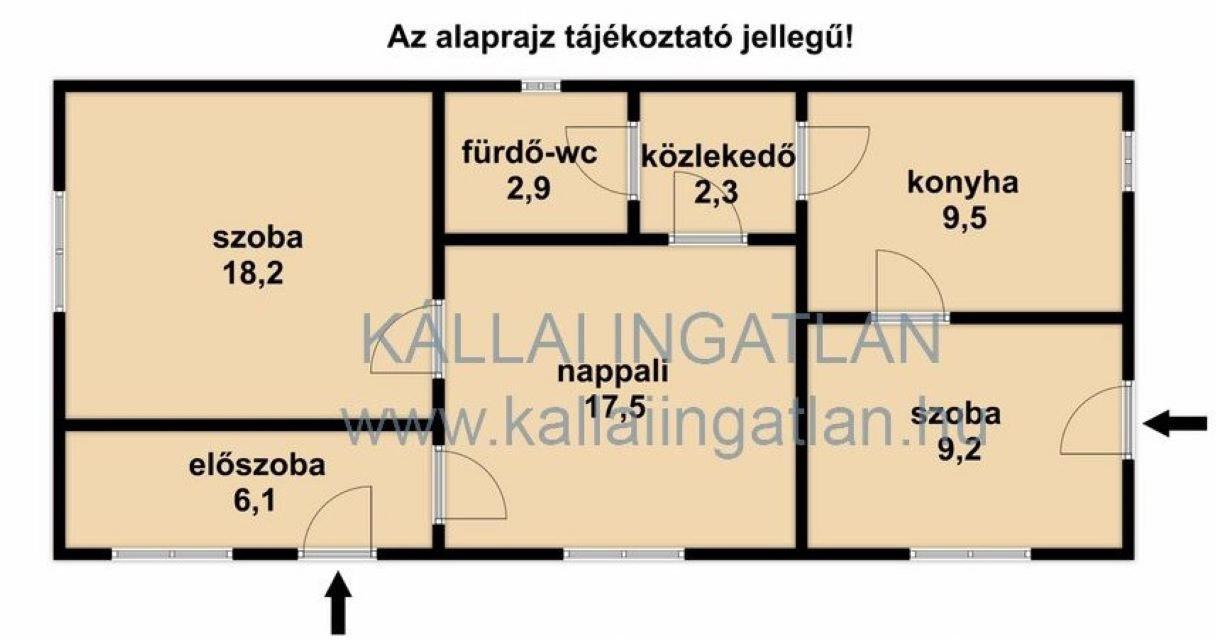 Elosztása: előszoba, nappali, kettő külön nyíló szoba, konyha, fürdő WC egy helyiségben. Az ingatlanhoz csatlakozik fedett terasz is.