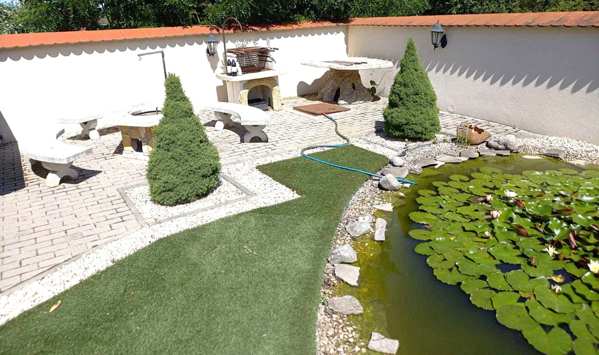 A kertben további kényelem vár: elektromos öntöző rendszer, térkövezett sétányok, dekoratív kerti tó és kiválóan felszerelt kerti grill.