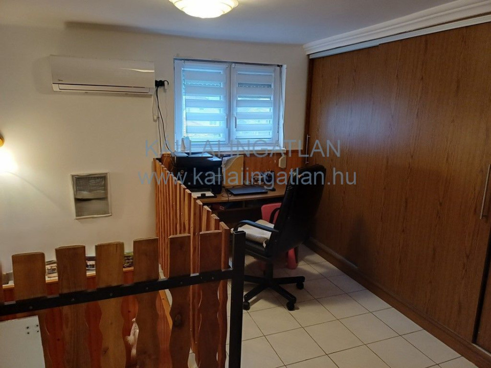 Az emeleti rész elosztása: kis dolgozósarok, két külön nyíló teljes értékű szoba, kádas fürdőszoba WC-vel, 10 nm-s erkély. Ezen a szinten egy hűtő-fűtő klíma került beépítésre.